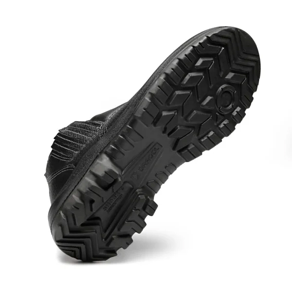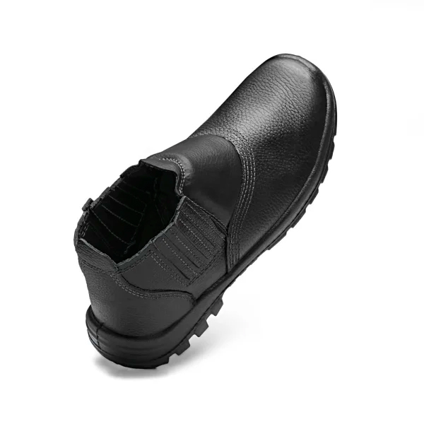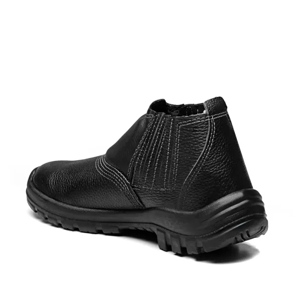 Botina para uso ocupacional, com elástico lateral recoberto, dorso acolchoado, confeccionada em couro estampa relax, forração interna da gáspea em não tecido e forro do cano em tecido com alto poder de absorção de suor, biqueira plástica conformada, sem componentes metálicos, palmilha de montagem em não tecido e sobrepalmilha em EVA 3mm e solado de poliuretano (PU), injeção direta monodensidade.